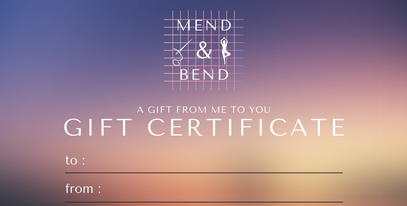 Gift certificates may be used for any of my Mending or Yoga classes or mending services and must be redeemed within 1 year of purchase date.